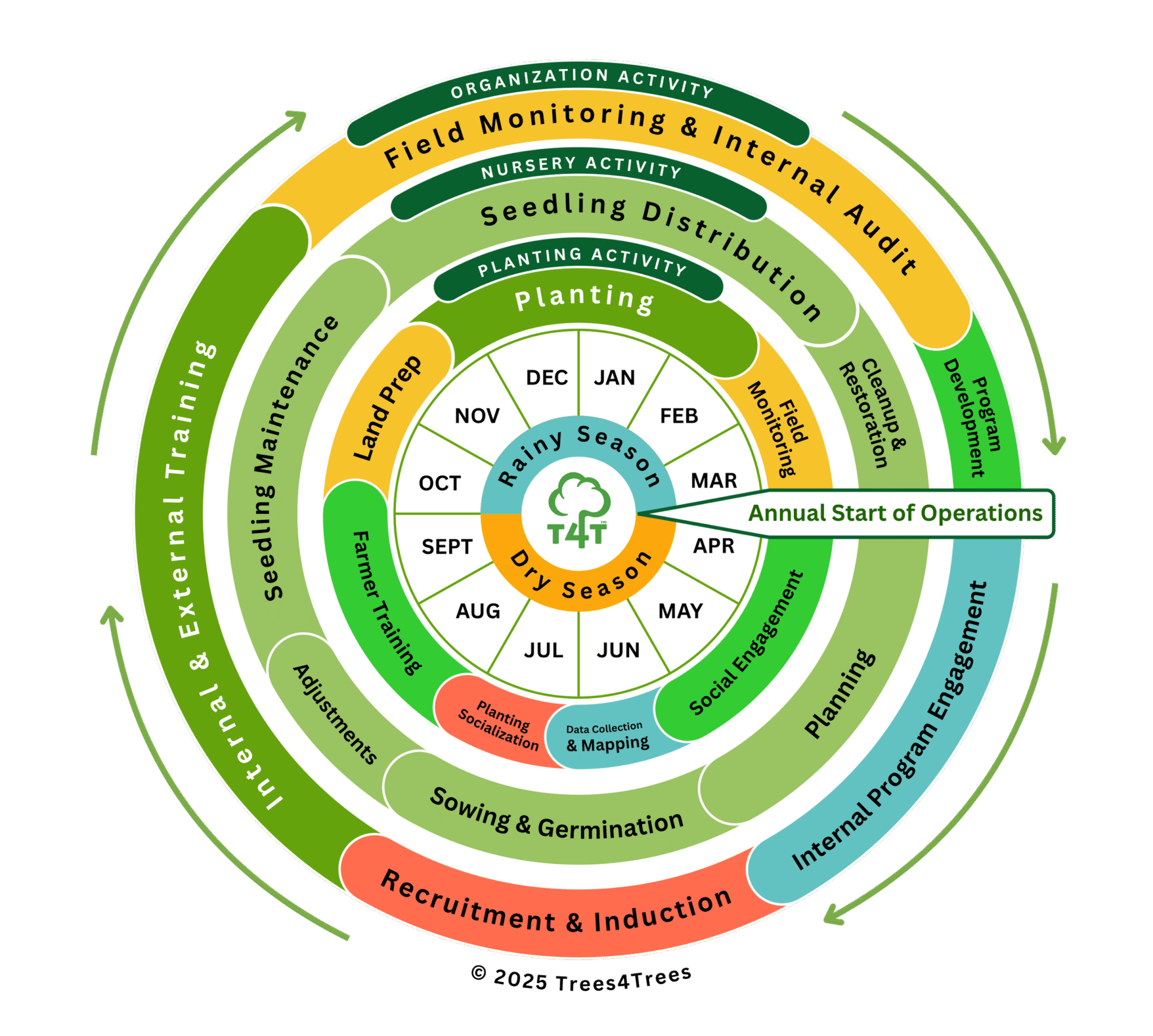 The Trees4Trees planting cycle commences during the rainy season, typically from November to December, and extends through March, maximizing tree survival rates.