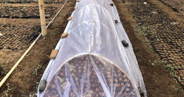 SoreangNursery team (above) is installing plastic plant covers to the sowing seedbeds. The plant covers the purposeof keeping the humidity andprotecting the little seedlings from rainwater runoff, wind, excessive sunlight, and pests’ attack. Pati Nursery team (below) is protecting avocado seedlings with plastic plant covers.