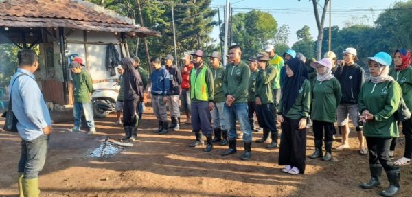The knowledge-sharing session with farmers includes a demonstration of how to create planting holes. The Ciwidey team is providing a practical example of the proper size and depth for planting holes to farmers in the villages of Sukawening.