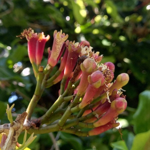 Clove or cengkih tree is an evergreen tree that grows between 8 and 30 meters tall. It has a medium-sized canopy with branches that start low on the trunk. The branches are numerous and grow slightly upward. Its flower buds are small with reddish-brown color.