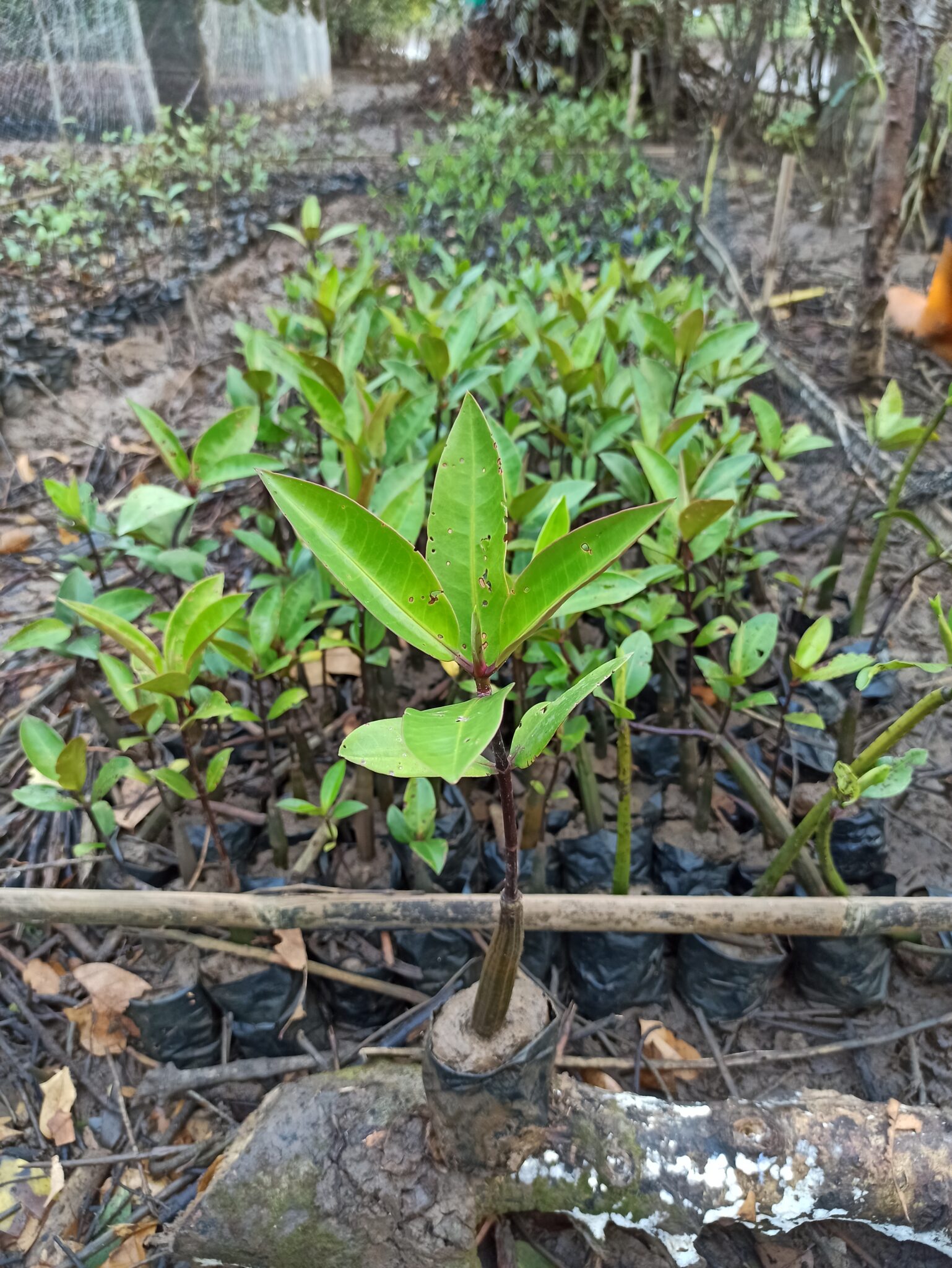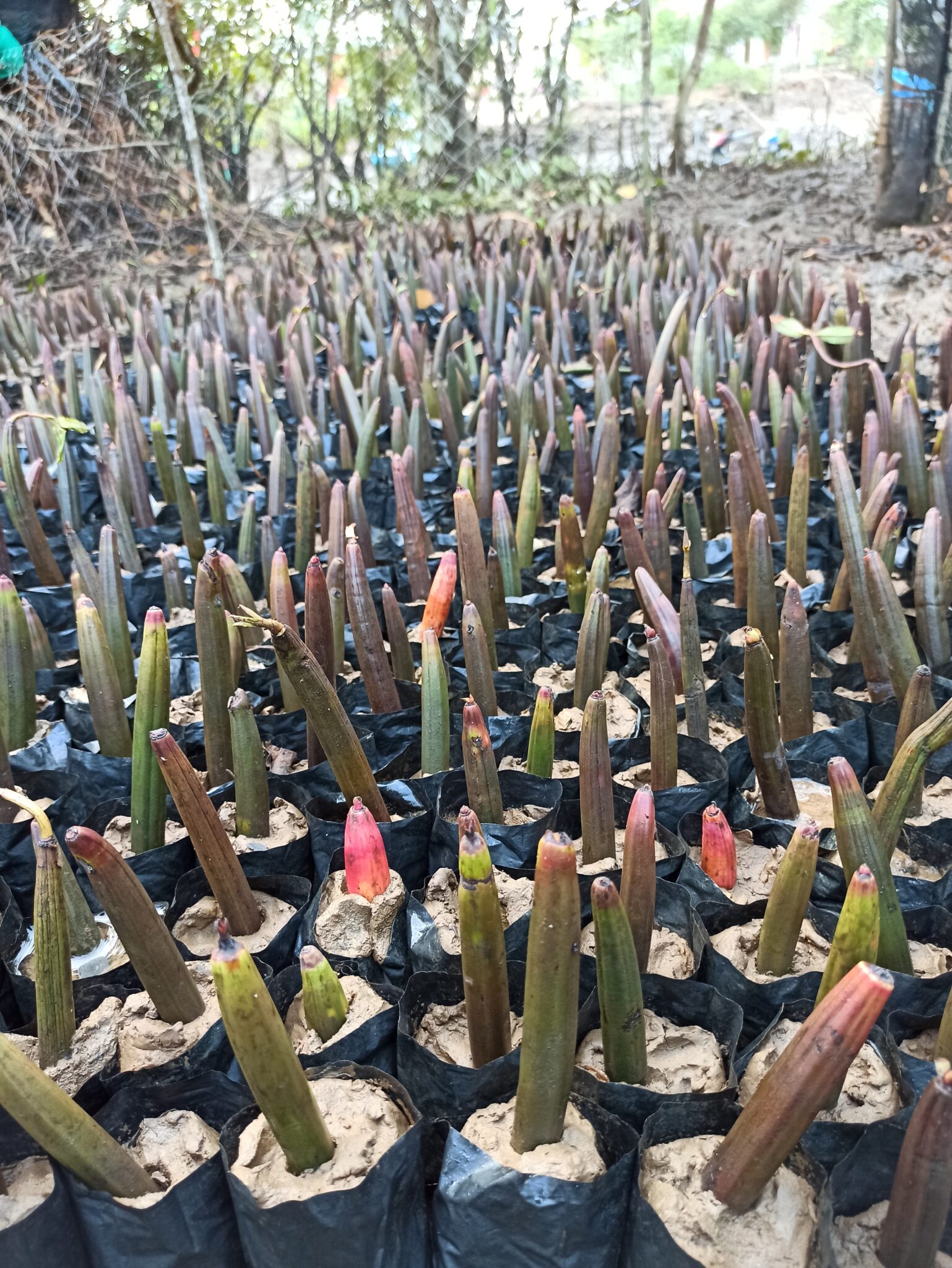 Generally, the Bruguiera gymnorrhiza species has pointed-shaped leaves with strong stems and thick roots, powerful in preventing erosion, storing carbon, and being a nursery ground for coastal animals. Most parts of the tree are also beneficial.