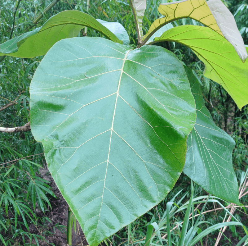 Teak leaves are multipurpose. Their durability makes them ideal as natural food wrappers, and they can also produce a reddish-brown natural dye. In traditional medicine, teak leaves are believed to help treat respiratory illnesses such as coughs, colds, and bronchitis.